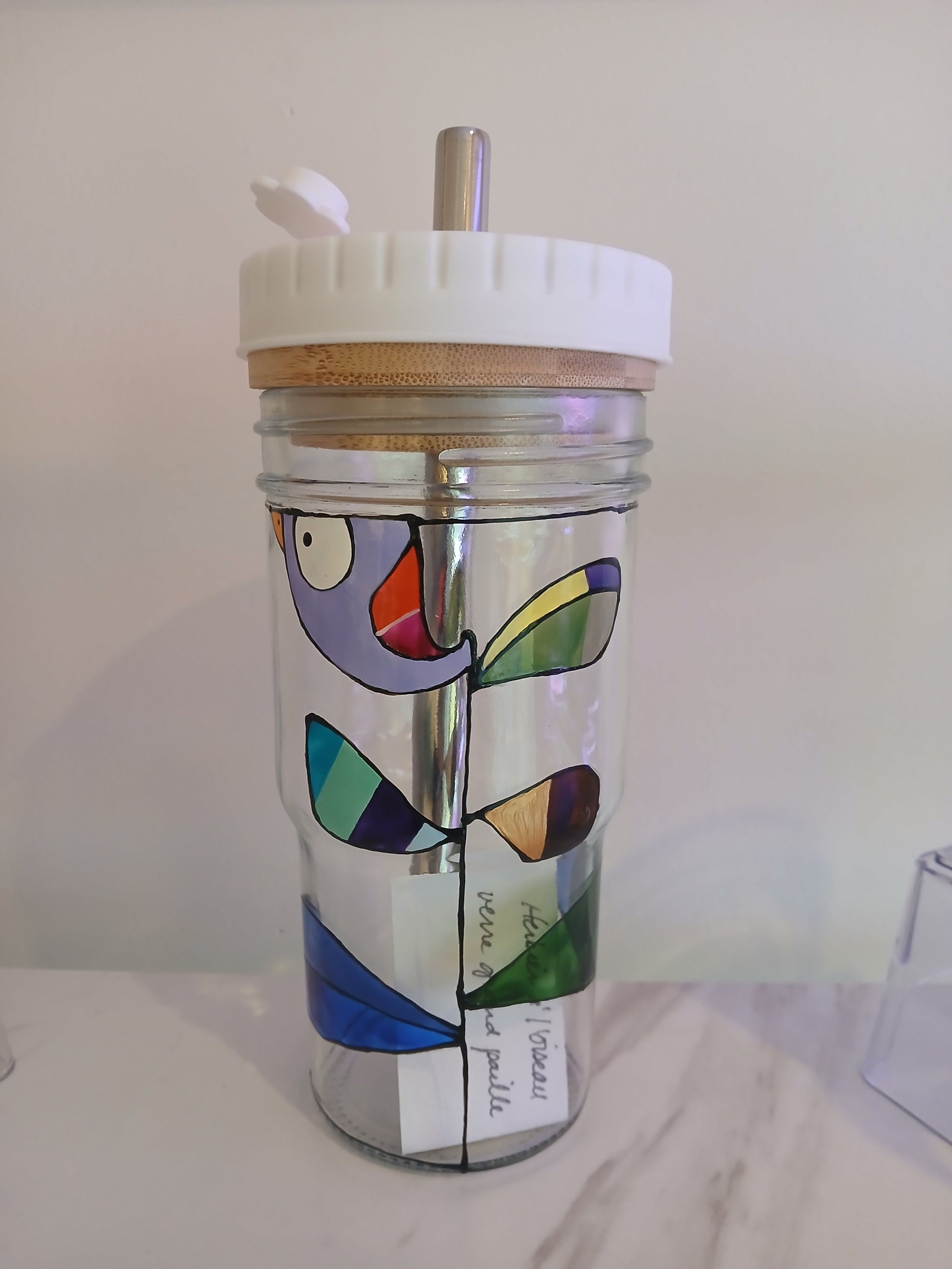 Comprend paille en acier inox ainsi qu'un couvercle en bambou et un couvercle de transport en plastique.